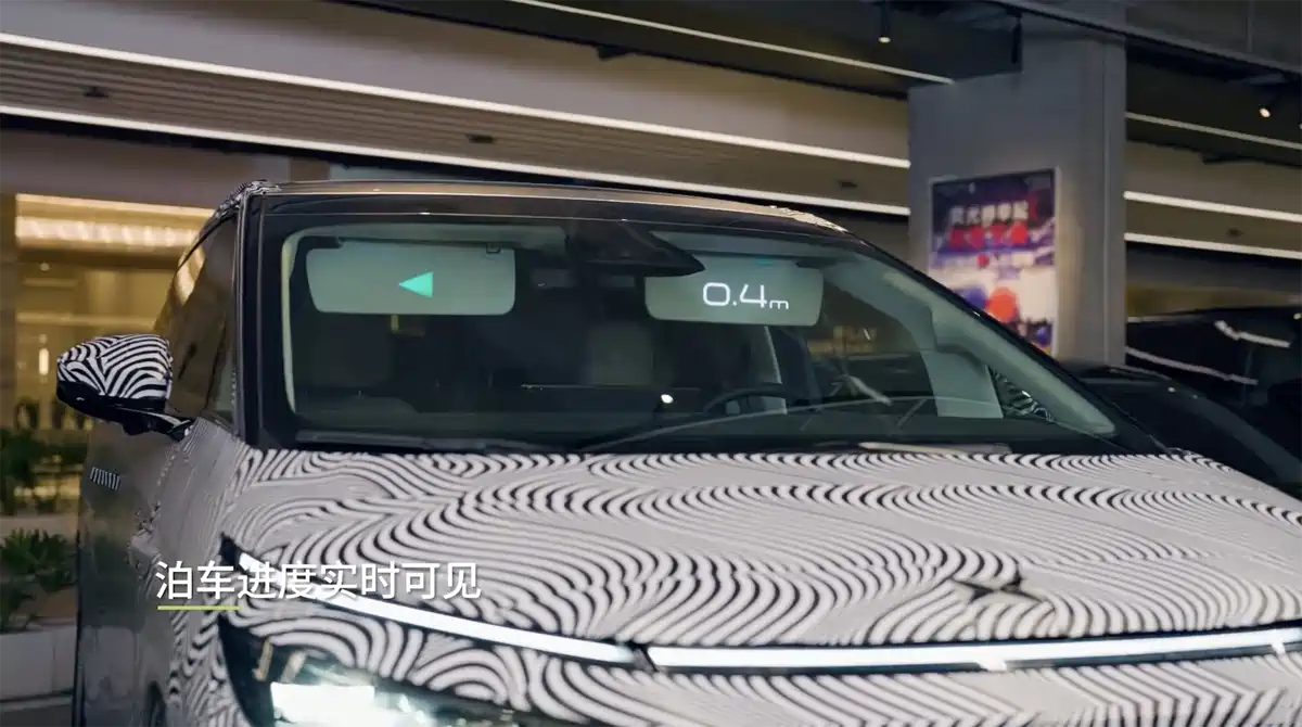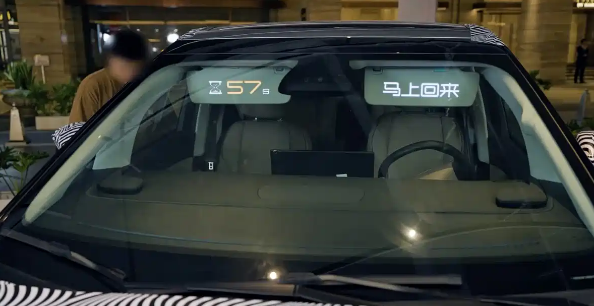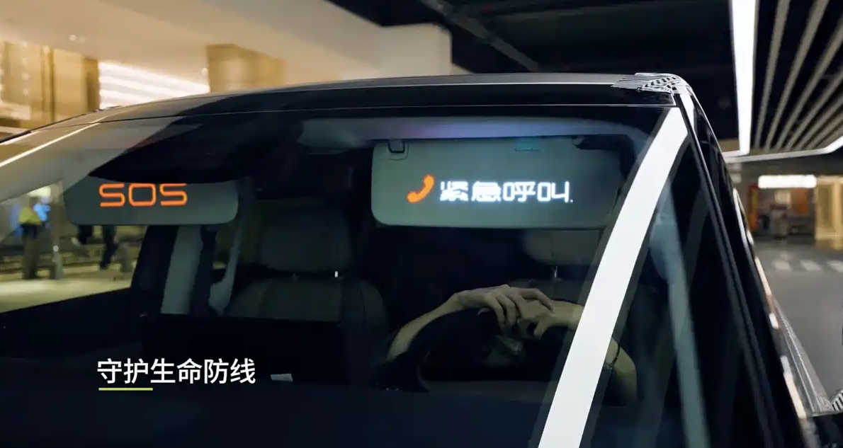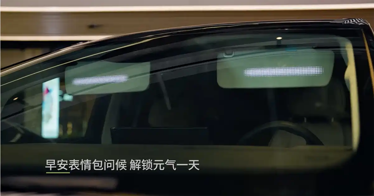 很光显,这是在遮阳板的后面野心了一块屏幕。该屏幕不错好意思满车搪塞互,比如与行东说念主的交互、车车交互、迎宾功能、停车请示等等;遮阳板上不错露馅的内容表面上是无尽多的,只需要配套对应的行径即可。