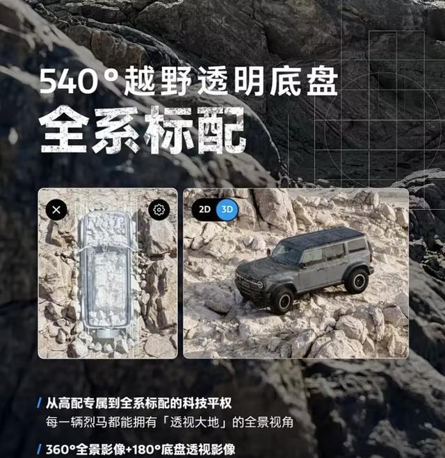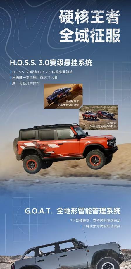 全系标配了540°越野透明底盘以及H.O.S.S. 3.0赛级悬架系统,并配备了FOX 2.5英寸内路旁通氮气减震器。此外,原厂提供35英寸大尺寸轮胎及可断开式防倾杆,进一步强化了极限地形通过智商。车辆搭载的G.O.A.T.全地形智能贬责系统复旧7种驾驶格式,并能与透明底盘功能齐备联动。