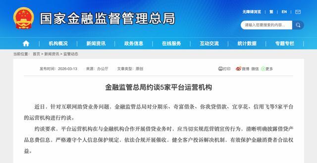 近日,针对互联网助贷业务问题,金融监管总局对分期乐、奇富欠据、你我贷借债、宜享花、信用飞等5家平台的运营机构进行约谈。