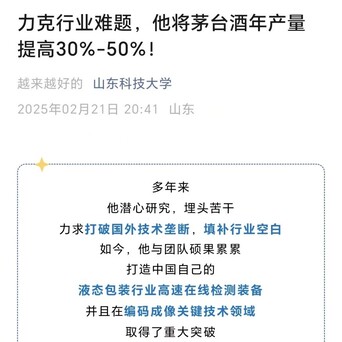另外皮22日傍晚,澎湃新闻在查询时发现,山东科技大学官方微信公众号已删除了前述 “将茅台的年产量提升了30%-50%”的有关著述。
