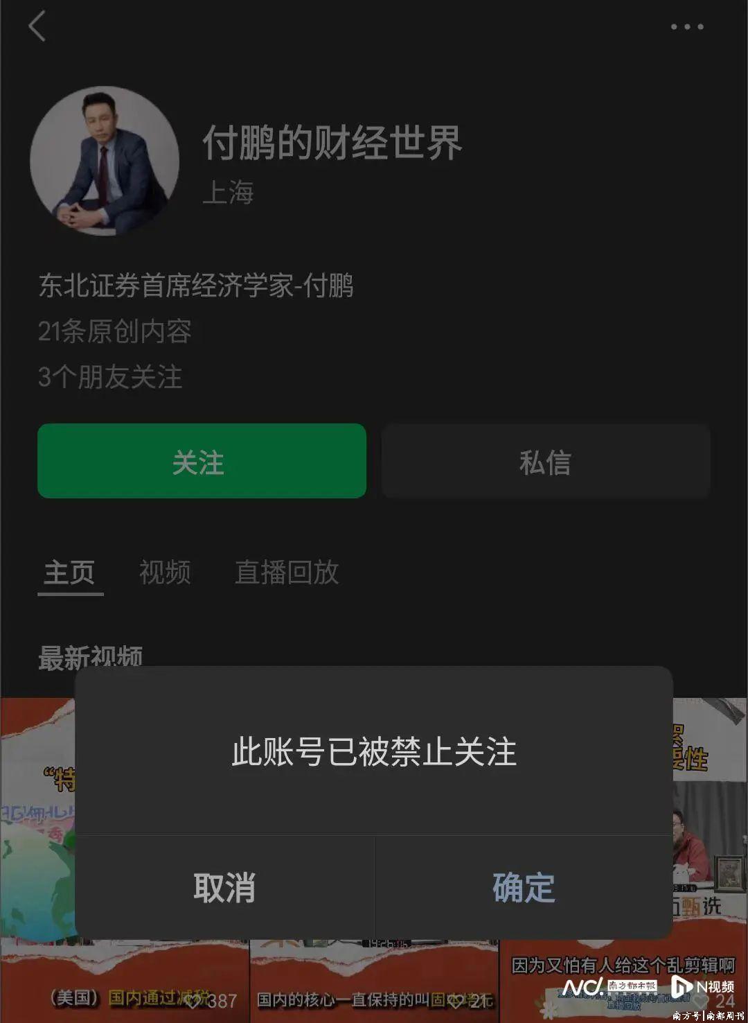 12月5日,南王人·湾财社记者郑重到,东北证券首席经济学家付鹏的微信视频号“付鹏的财经宇宙”已被不容温雅。对此,记者尝试探究付鹏本东谈主,截止现在电话未能接通。